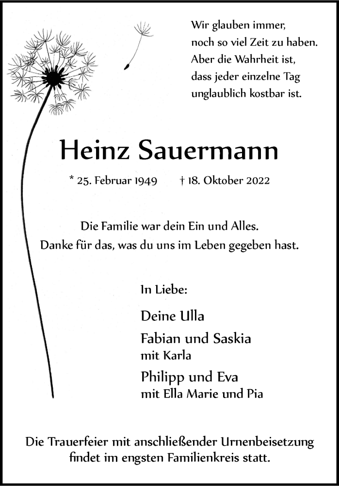 Hier finden Sie alle Traueranzeigen aus der Zeitung, die bisher für Heinz Sauermann erschienen sind. Weitere Traueranzeigen, die in der Zeitung erscheinen, werden hier ebenfalls aufgelistet