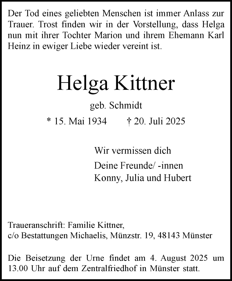 Hier finden Sie alle Traueranzeigen aus der Zeitung, die bisher für Helga Kittner erschienen sind. Weitere Traueranzeigen, die in der Zeitung erscheinen, werden hier ebenfalls aufgelistet