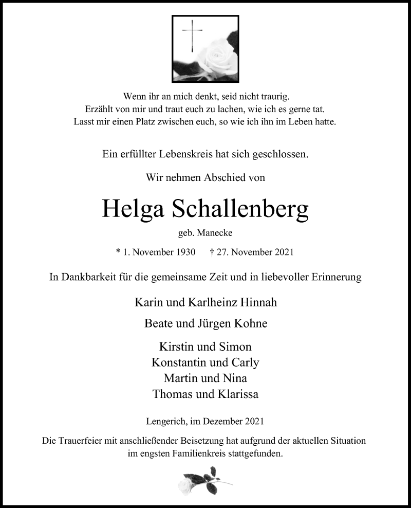 Hier finden Sie alle Traueranzeigen aus der Zeitung, die bisher für Helga Schallenberg erschienen sind. Weitere Traueranzeigen, die in der Zeitung erscheinen, werden hier ebenfalls aufgelistet