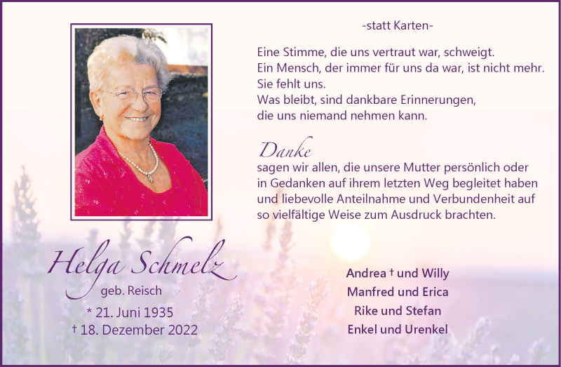 Hier finden Sie alle Traueranzeigen aus der Zeitung, die bisher für Helga Schmelz erschienen sind. Weitere Traueranzeigen, die in der Zeitung erscheinen, werden hier ebenfalls aufgelistet