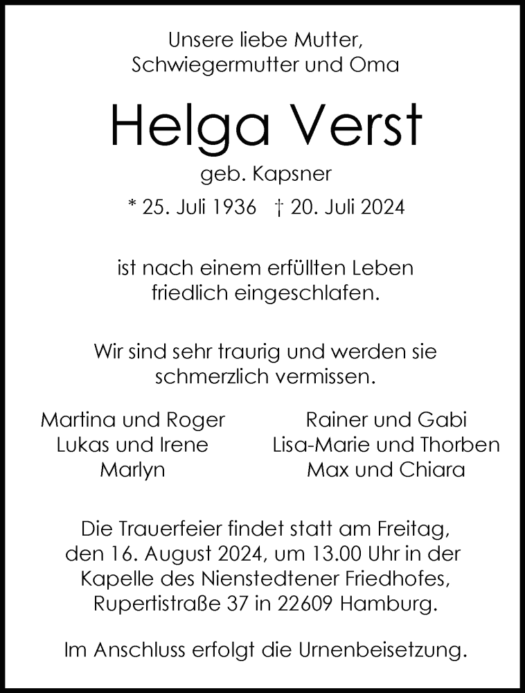 Hier finden Sie alle Traueranzeigen aus der Zeitung, die bisher für Helga Verst erschienen sind. Weitere Traueranzeigen, die in der Zeitung erscheinen, werden hier ebenfalls aufgelistet