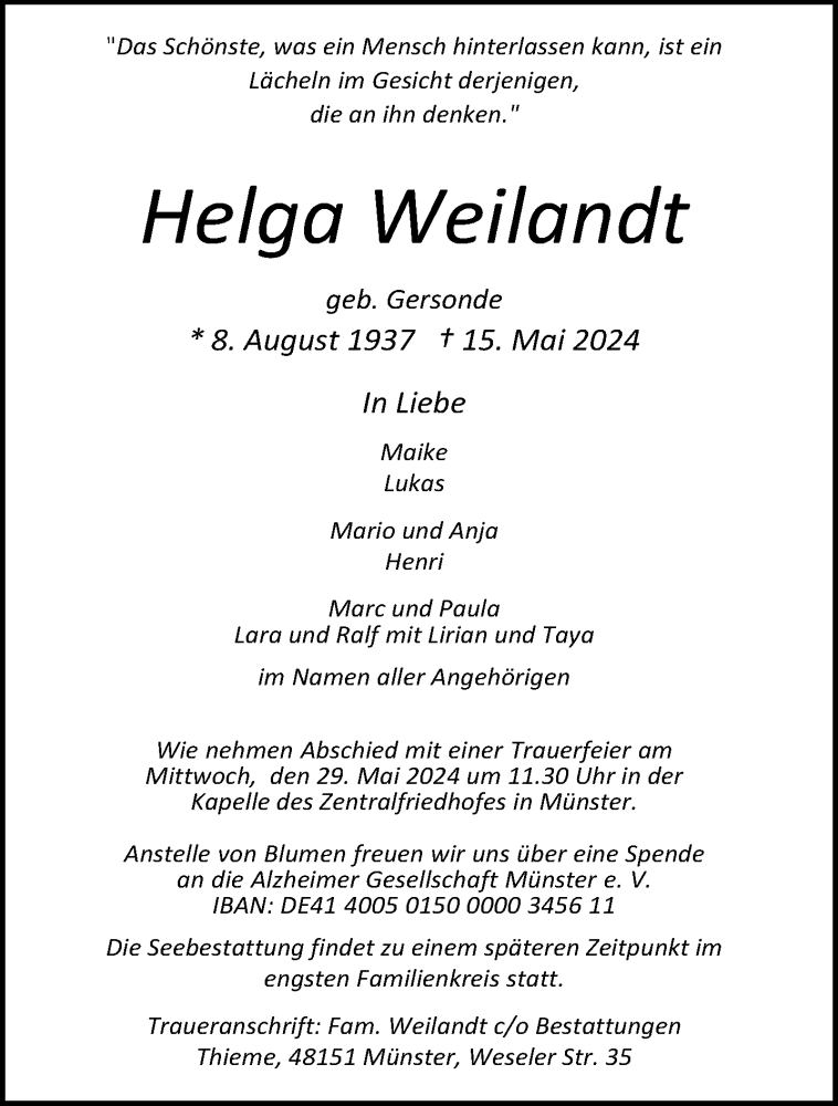 Hier finden Sie alle Traueranzeigen aus der Zeitung, die bisher für Helga Weilandt erschienen sind. Weitere Traueranzeigen, die in der Zeitung erscheinen, werden hier ebenfalls aufgelistet