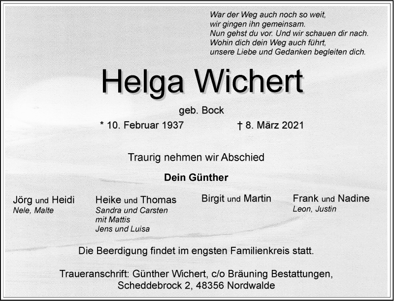 Hier finden Sie alle Traueranzeigen aus der Zeitung, die bisher für Helga Wichert erschienen sind. Weitere Traueranzeigen, die in der Zeitung erscheinen, werden hier ebenfalls aufgelistet