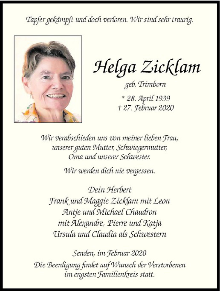 Hier finden Sie alle Traueranzeigen aus der Zeitung, die bisher für Helga Zicklam erschienen sind. Weitere Traueranzeigen, die in der Zeitung erscheinen, werden hier ebenfalls aufgelistet