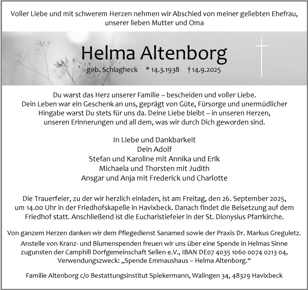 Hier finden Sie alle Traueranzeigen aus der Zeitung, die bisher für Helma Altenborg erschienen sind. Weitere Traueranzeigen, die in der Zeitung erscheinen, werden hier ebenfalls aufgelistet