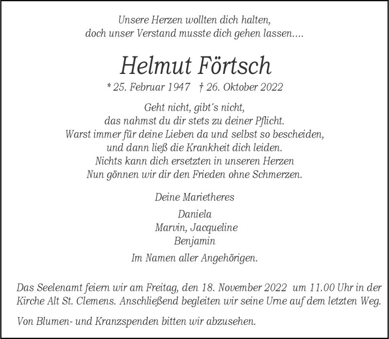 Hier finden Sie alle Traueranzeigen aus der Zeitung, die bisher für Helmut Förtsch erschienen sind. Weitere Traueranzeigen, die in der Zeitung erscheinen, werden hier ebenfalls aufgelistet