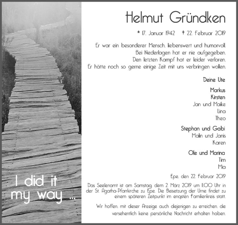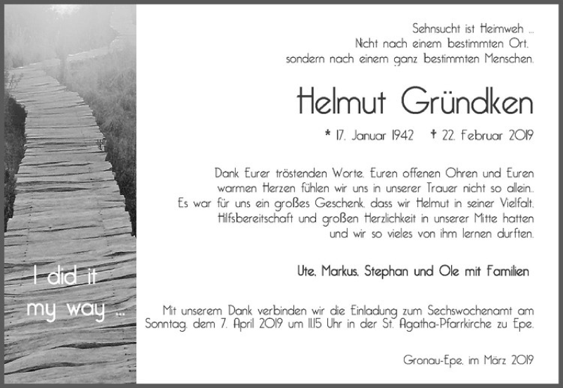 Hier finden Sie alle Traueranzeigen aus der Zeitung, die bisher für Helmut Gründken erschienen sind. Weitere Traueranzeigen, die in der Zeitung erscheinen, werden hier ebenfalls aufgelistet