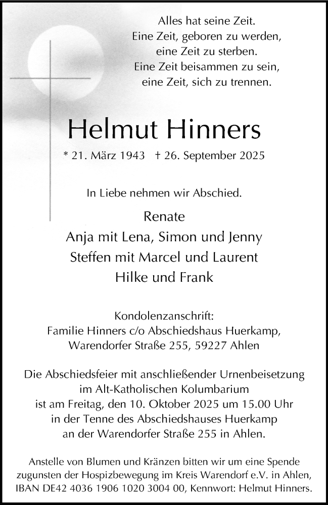 Hier finden Sie alle Traueranzeigen aus der Zeitung, die bisher für Helmut Hinners erschienen sind. Weitere Traueranzeigen, die in der Zeitung erscheinen, werden hier ebenfalls aufgelistet