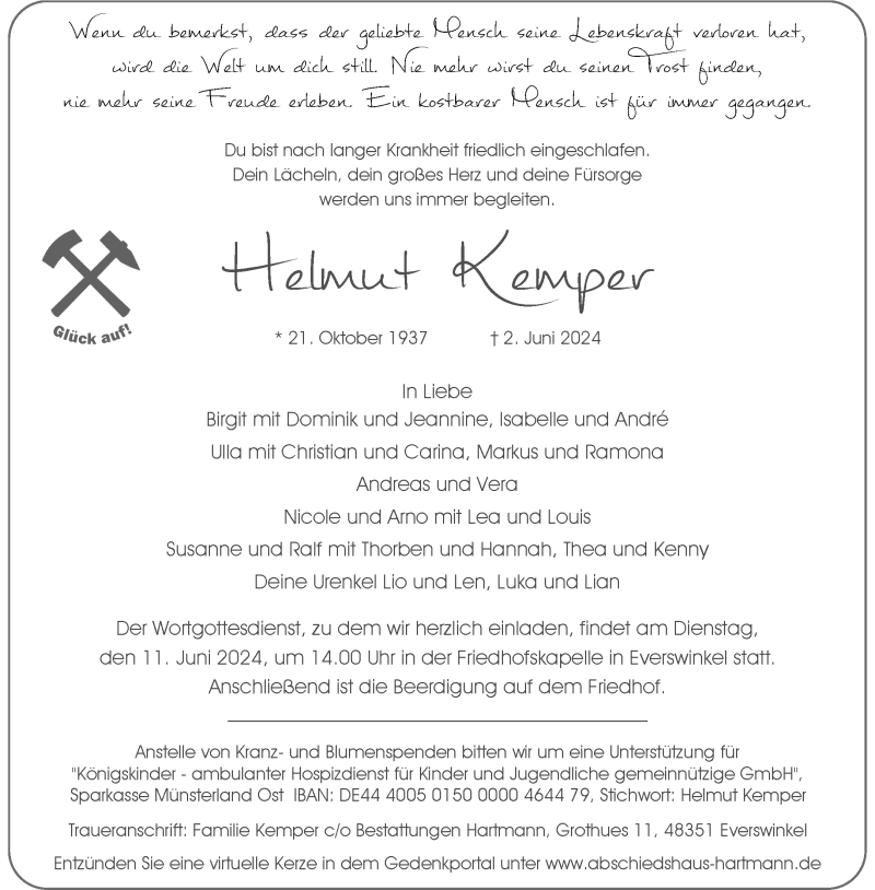 Hier finden Sie alle Traueranzeigen aus der Zeitung, die bisher für Helmut Kemper erschienen sind. Weitere Traueranzeigen, die in der Zeitung erscheinen, werden hier ebenfalls aufgelistet