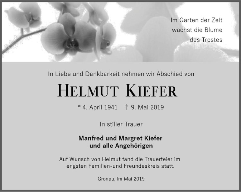 Hier finden Sie alle Traueranzeigen aus der Zeitung, die bisher für Helmut Kiefer erschienen sind. Weitere Traueranzeigen, die in der Zeitung erscheinen, werden hier ebenfalls aufgelistet
