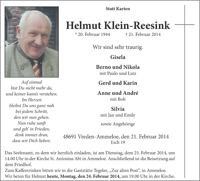 Hier finden Sie alle Traueranzeigen aus der Zeitung, die bisher für Helmut Klein-Reesink erschienen sind. Weitere Traueranzeigen, die in der Zeitung erscheinen, werden hier ebenfalls aufgelistet
