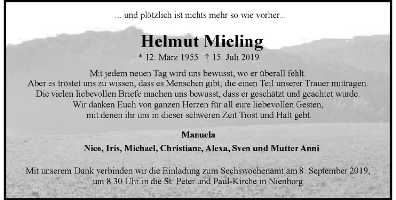 Hier finden Sie alle Traueranzeigen aus der Zeitung, die bisher für Helmut Mieling erschienen sind. Weitere Traueranzeigen, die in der Zeitung erscheinen, werden hier ebenfalls aufgelistet