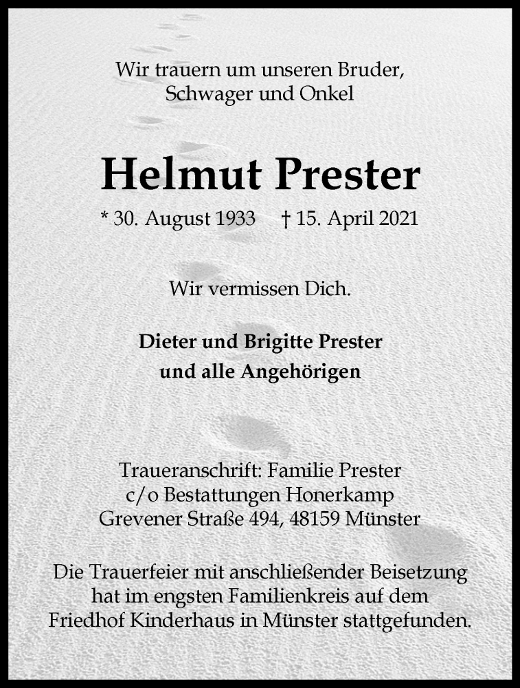 Hier finden Sie alle Traueranzeigen aus der Zeitung, die bisher für Helmut Prester erschienen sind. Weitere Traueranzeigen, die in der Zeitung erscheinen, werden hier ebenfalls aufgelistet