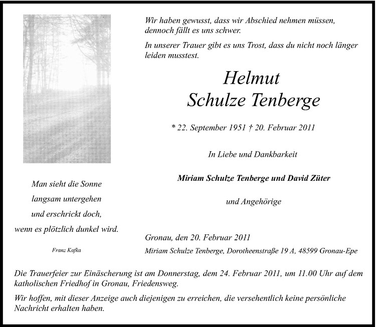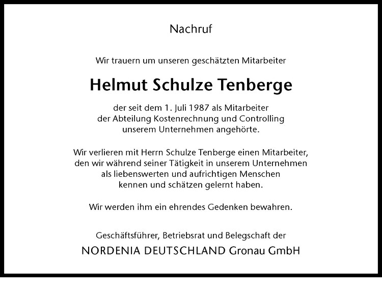 Hier finden Sie alle Traueranzeigen aus der Zeitung, die bisher für Helmut Schulze Tenberge erschienen sind. Weitere Traueranzeigen, die in der Zeitung erscheinen, werden hier ebenfalls aufgelistet