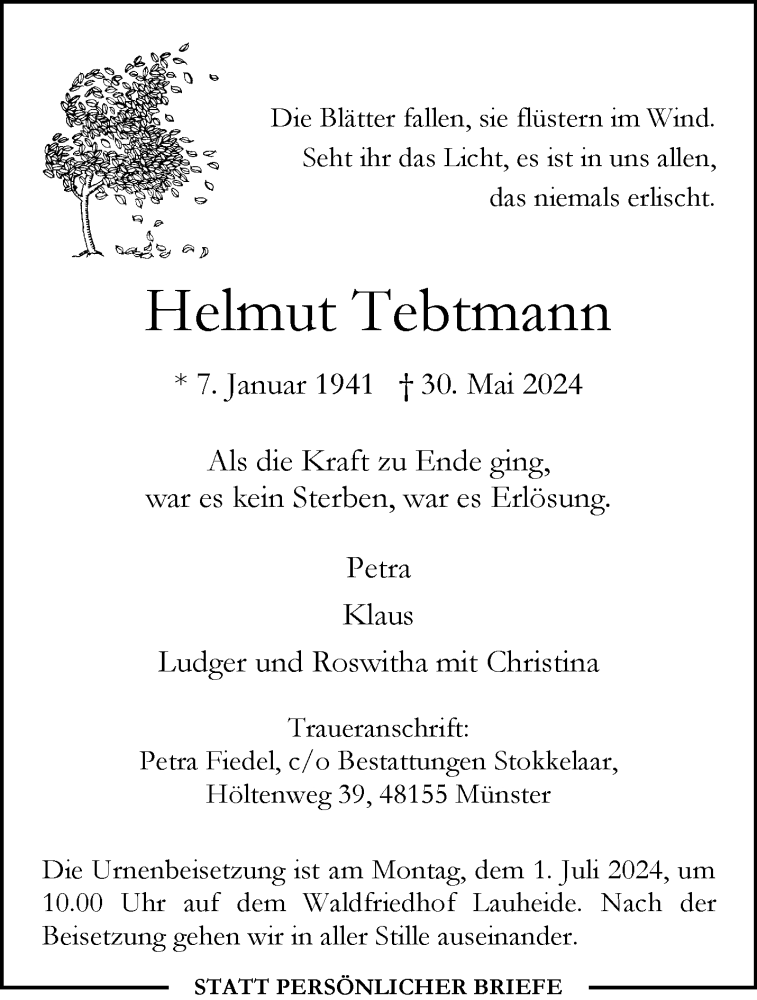 Hier finden Sie alle Traueranzeigen aus der Zeitung, die bisher für Helmut Tebtmann erschienen sind. Weitere Traueranzeigen, die in der Zeitung erscheinen, werden hier ebenfalls aufgelistet