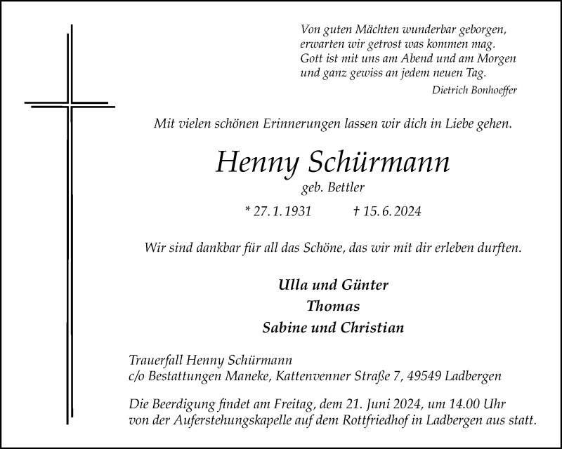 Hier finden Sie alle Traueranzeigen aus der Zeitung, die bisher für Henny Schürmann erschienen sind. Weitere Traueranzeigen, die in der Zeitung erscheinen, werden hier ebenfalls aufgelistet
