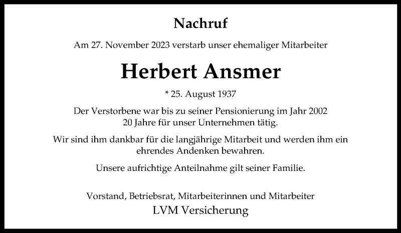 Hier finden Sie alle Traueranzeigen aus der Zeitung, die bisher für Herbert Ansmer erschienen sind. Weitere Traueranzeigen, die in der Zeitung erscheinen, werden hier ebenfalls aufgelistet