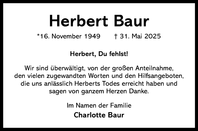 Hier finden Sie alle Traueranzeigen aus der Zeitung, die bisher für Herbert Baur erschienen sind. Weitere Traueranzeigen, die in der Zeitung erscheinen, werden hier ebenfalls aufgelistet