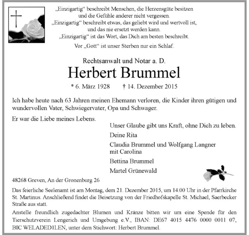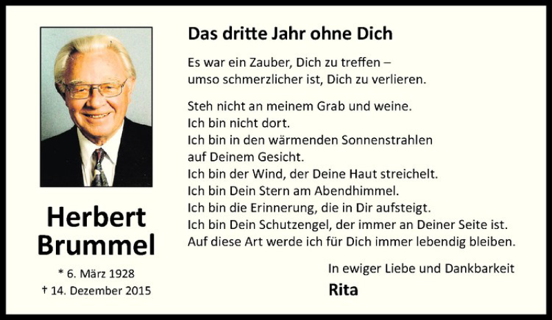 Hier finden Sie alle Traueranzeigen aus der Zeitung, die bisher für Herbert Brummel erschienen sind. Weitere Traueranzeigen, die in der Zeitung erscheinen, werden hier ebenfalls aufgelistet