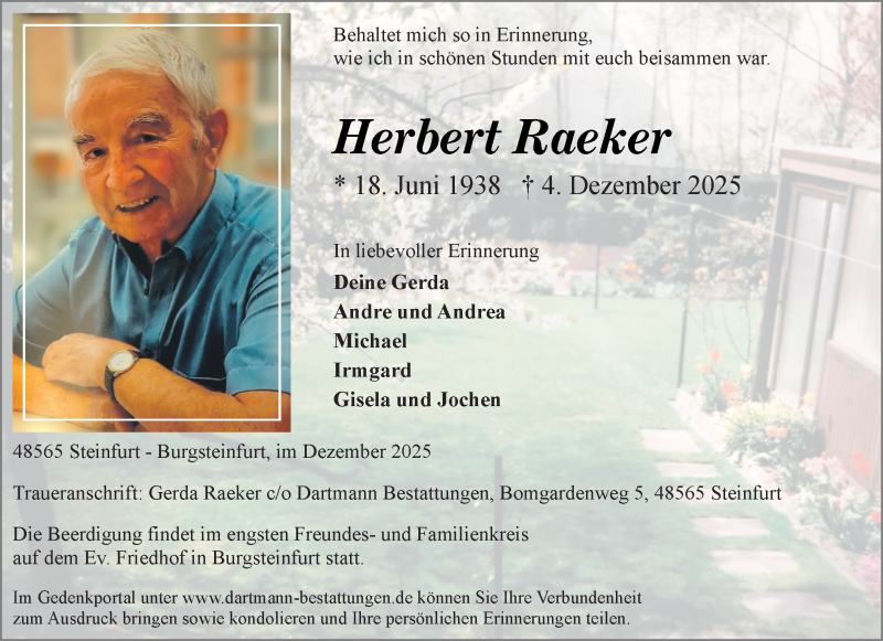 Hier finden Sie alle Traueranzeigen aus der Zeitung, die bisher für Herbert Raeker erschienen sind. Weitere Traueranzeigen, die in der Zeitung erscheinen, werden hier ebenfalls aufgelistet