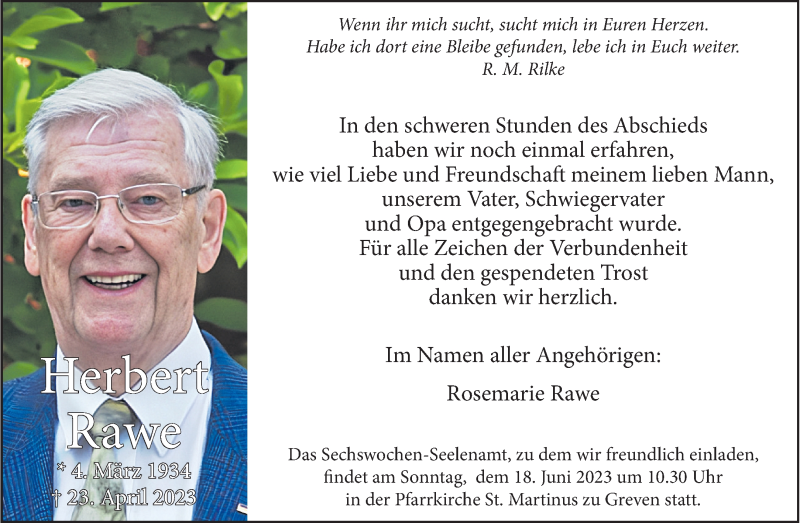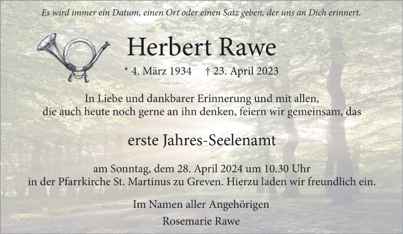 Hier finden Sie alle Traueranzeigen aus der Zeitung, die bisher für Herbert Rawe erschienen sind. Weitere Traueranzeigen, die in der Zeitung erscheinen, werden hier ebenfalls aufgelistet