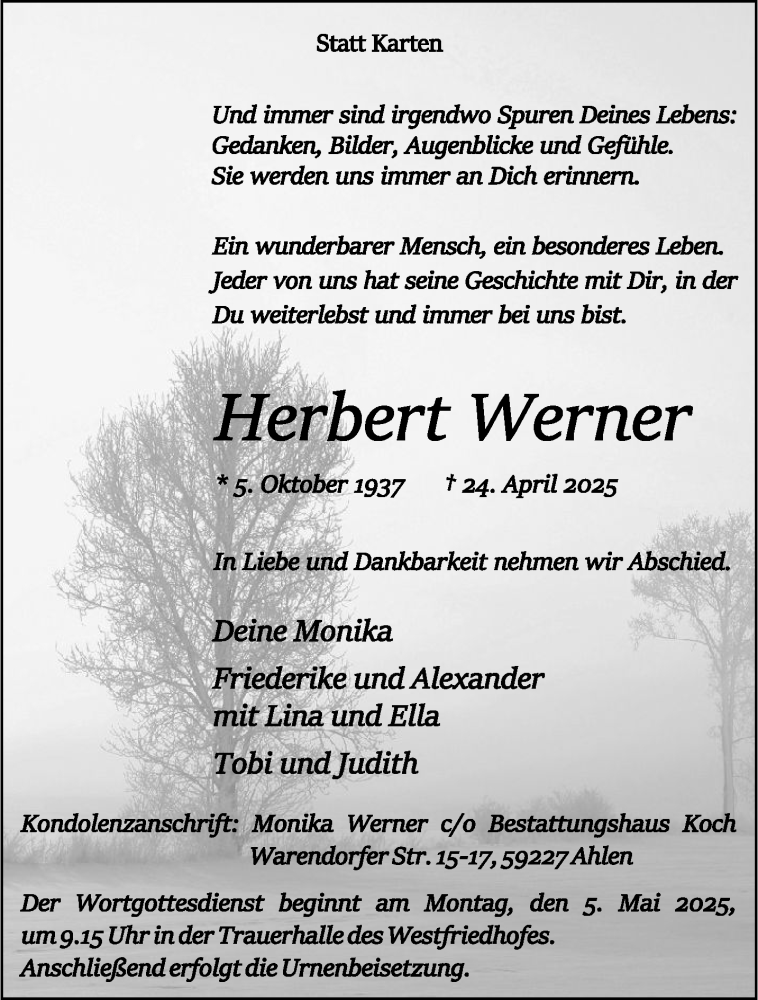 Hier finden Sie alle Traueranzeigen aus der Zeitung, die bisher für Herbert Werner erschienen sind. Weitere Traueranzeigen, die in der Zeitung erscheinen, werden hier ebenfalls aufgelistet