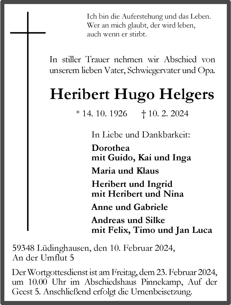 Hier finden Sie alle Traueranzeigen aus der Zeitung, die bisher für Heribert Hugo Helgers erschienen sind. Weitere Traueranzeigen, die in der Zeitung erscheinen, werden hier ebenfalls aufgelistet
