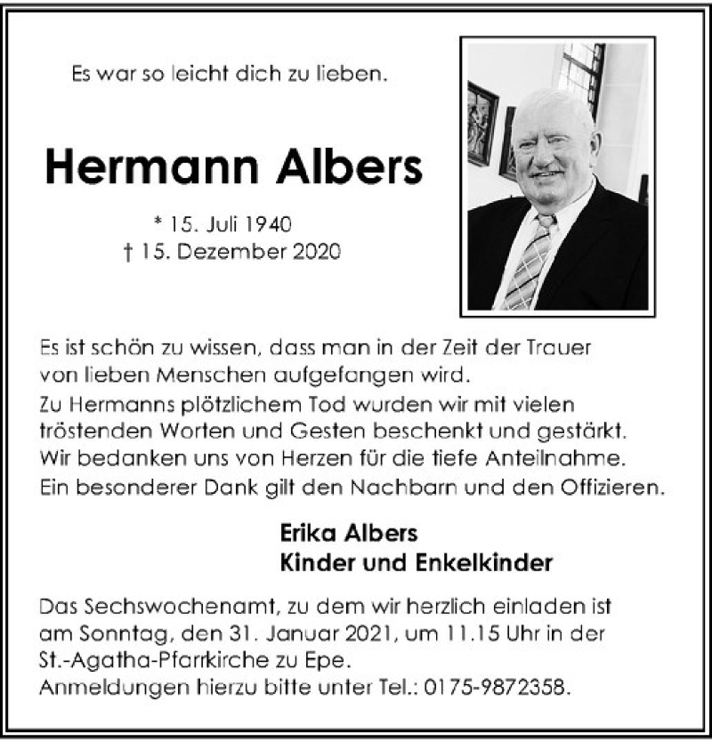 Hier finden Sie alle Traueranzeigen aus der Zeitung, die bisher für Hermann Albers erschienen sind. Weitere Traueranzeigen, die in der Zeitung erscheinen, werden hier ebenfalls aufgelistet