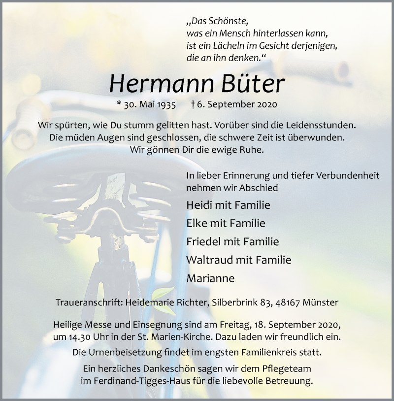 Hier finden Sie alle Traueranzeigen aus der Zeitung, die bisher für Hermann Büter erschienen sind. Weitere Traueranzeigen, die in der Zeitung erscheinen, werden hier ebenfalls aufgelistet