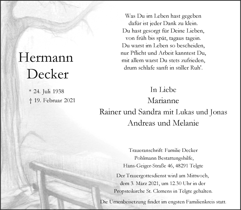 Hier finden Sie alle Traueranzeigen aus der Zeitung, die bisher für Hermann Decker erschienen sind. Weitere Traueranzeigen, die in der Zeitung erscheinen, werden hier ebenfalls aufgelistet