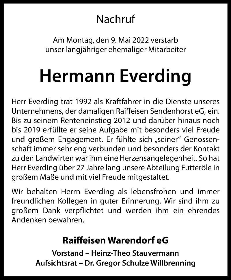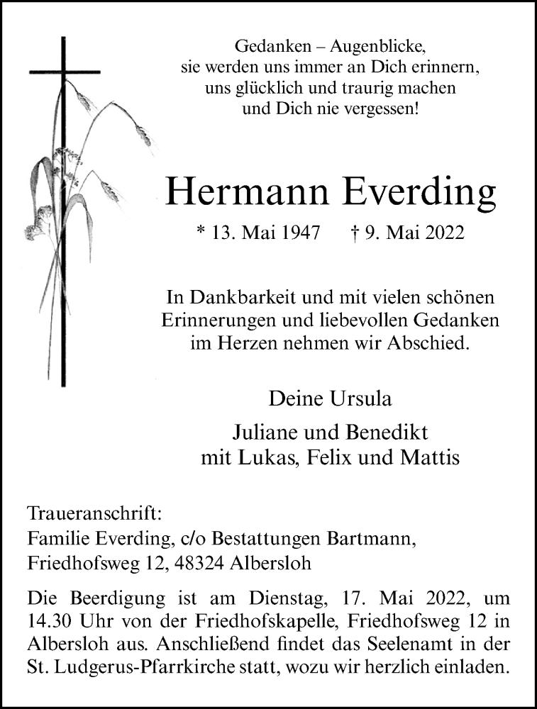 Hier finden Sie alle Traueranzeigen aus der Zeitung, die bisher für Hermann Everding erschienen sind. Weitere Traueranzeigen, die in der Zeitung erscheinen, werden hier ebenfalls aufgelistet