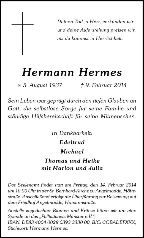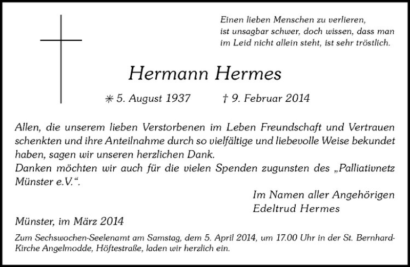 Hier finden Sie alle Traueranzeigen aus der Zeitung, die bisher für Hermann Hermes erschienen sind. Weitere Traueranzeigen, die in der Zeitung erscheinen, werden hier ebenfalls aufgelistet