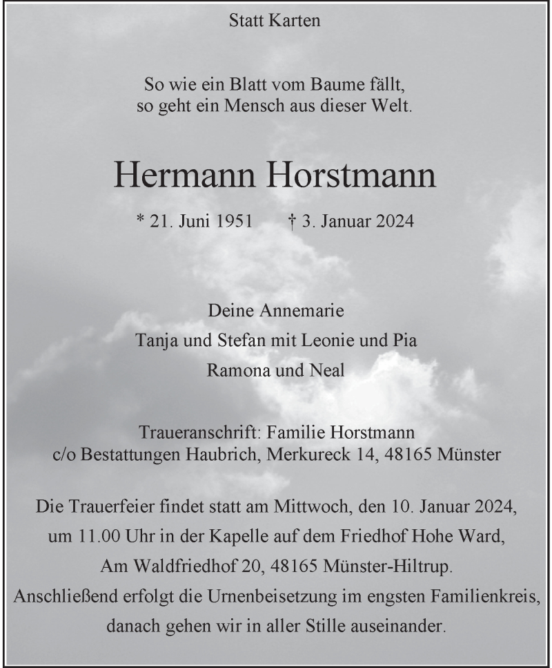 Hier finden Sie alle Traueranzeigen aus der Zeitung, die bisher für Hermann Horstmann erschienen sind. Weitere Traueranzeigen, die in der Zeitung erscheinen, werden hier ebenfalls aufgelistet