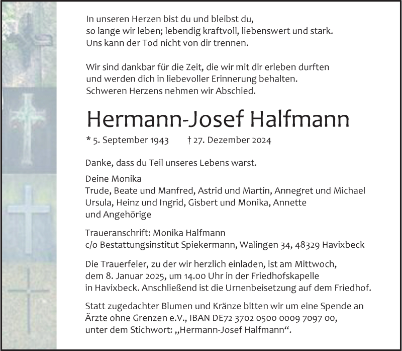 Hier finden Sie alle Traueranzeigen aus der Zeitung, die bisher für Hermann-Josef Halfmann erschienen sind. Weitere Traueranzeigen, die in der Zeitung erscheinen, werden hier ebenfalls aufgelistet