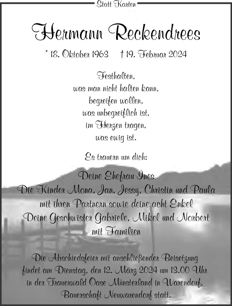 Hier finden Sie alle Traueranzeigen aus der Zeitung, die bisher für Hermann Reckendrees erschienen sind. Weitere Traueranzeigen, die in der Zeitung erscheinen, werden hier ebenfalls aufgelistet
