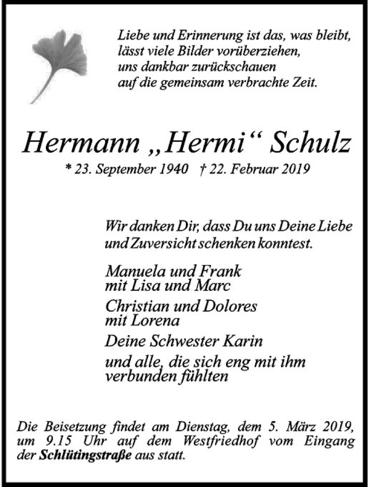 Hier finden Sie alle Traueranzeigen aus der Zeitung, die bisher für Hermann Schulz erschienen sind. Weitere Traueranzeigen, die in der Zeitung erscheinen, werden hier ebenfalls aufgelistet
