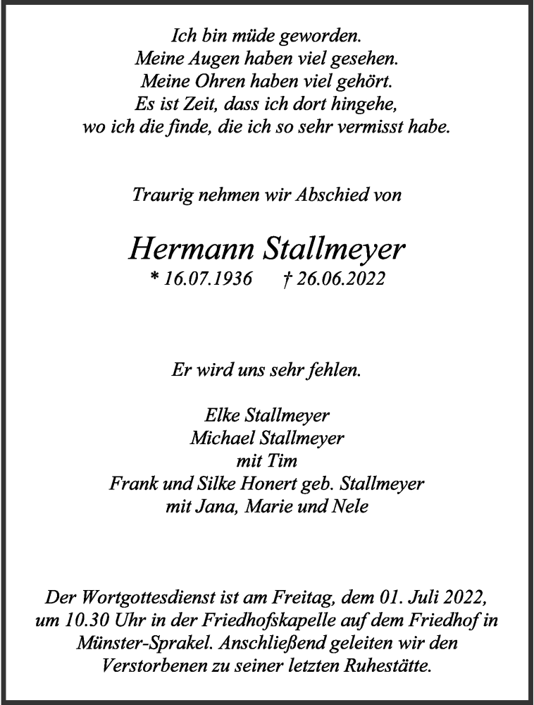 Hier finden Sie alle Traueranzeigen aus der Zeitung, die bisher für Hermann Stallmeyer erschienen sind. Weitere Traueranzeigen, die in der Zeitung erscheinen, werden hier ebenfalls aufgelistet
