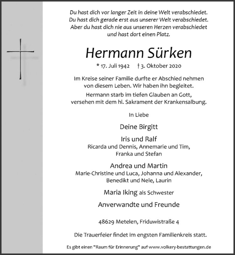 Hier finden Sie alle Traueranzeigen aus der Zeitung, die bisher für Hermann Sürken erschienen sind. Weitere Traueranzeigen, die in der Zeitung erscheinen, werden hier ebenfalls aufgelistet