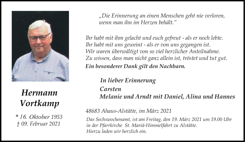 Hier finden Sie alle Traueranzeigen aus der Zeitung, die bisher für Hermann Vortkamp erschienen sind. Weitere Traueranzeigen, die in der Zeitung erscheinen, werden hier ebenfalls aufgelistet