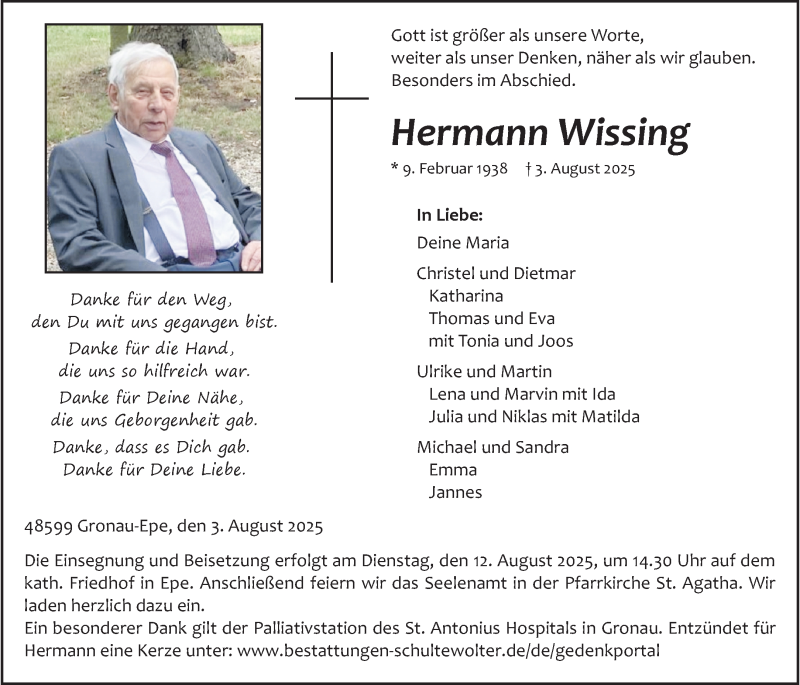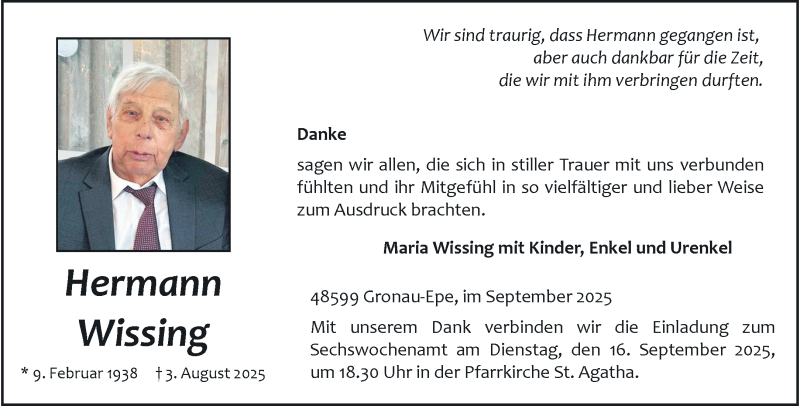 Hier finden Sie alle Traueranzeigen aus der Zeitung, die bisher für Hermann Wissing erschienen sind. Weitere Traueranzeigen, die in der Zeitung erscheinen, werden hier ebenfalls aufgelistet