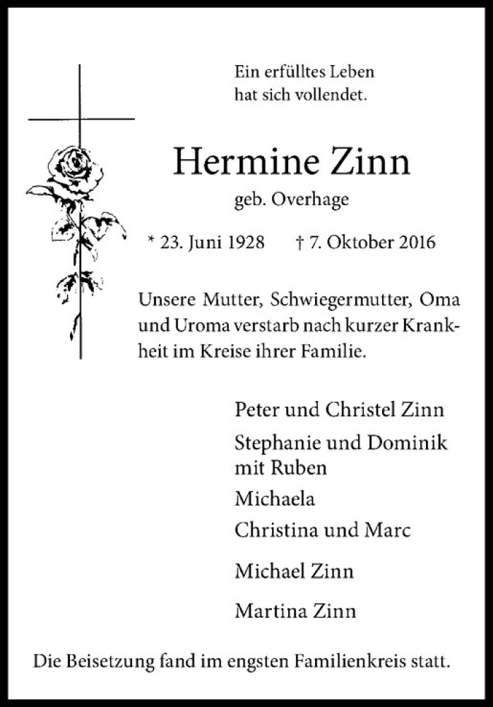 Hier finden Sie alle Traueranzeigen aus der Zeitung, die bisher für Hermine Zinn erschienen sind. Weitere Traueranzeigen, die in der Zeitung erscheinen, werden hier ebenfalls aufgelistet