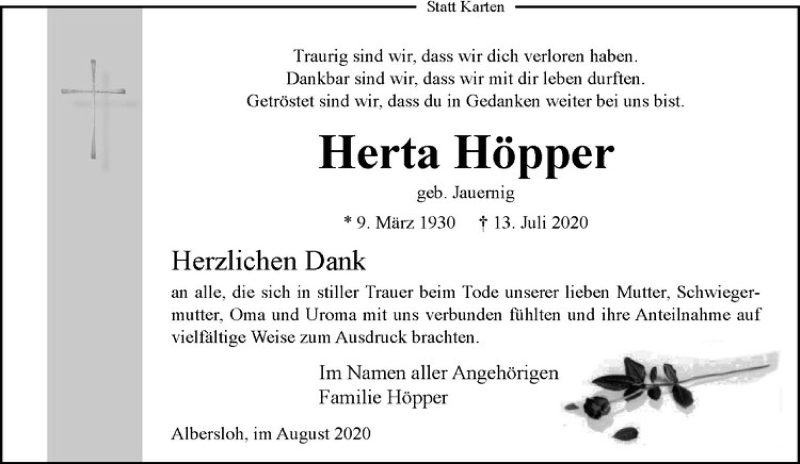 Hier finden Sie alle Traueranzeigen aus der Zeitung, die bisher für Herta Höpper erschienen sind. Weitere Traueranzeigen, die in der Zeitung erscheinen, werden hier ebenfalls aufgelistet