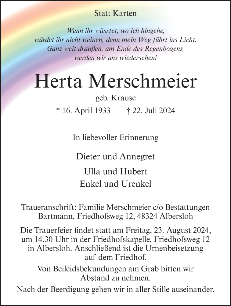 Hier finden Sie alle Traueranzeigen aus der Zeitung, die bisher für Herta Merschmeier erschienen sind. Weitere Traueranzeigen, die in der Zeitung erscheinen, werden hier ebenfalls aufgelistet