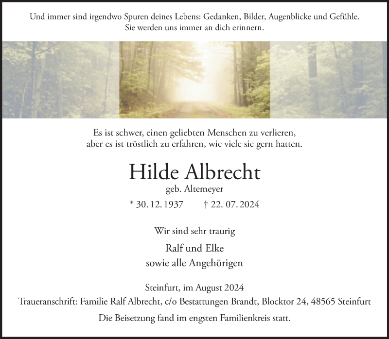 Hier finden Sie alle Traueranzeigen aus der Zeitung, die bisher für Hilde Albrecht erschienen sind. Weitere Traueranzeigen, die in der Zeitung erscheinen, werden hier ebenfalls aufgelistet