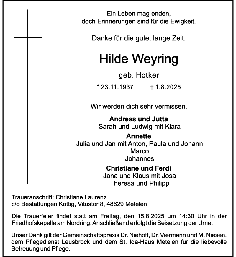 Hier finden Sie alle Traueranzeigen aus der Zeitung, die bisher für Hilde Weyring erschienen sind. Weitere Traueranzeigen, die in der Zeitung erscheinen, werden hier ebenfalls aufgelistet
