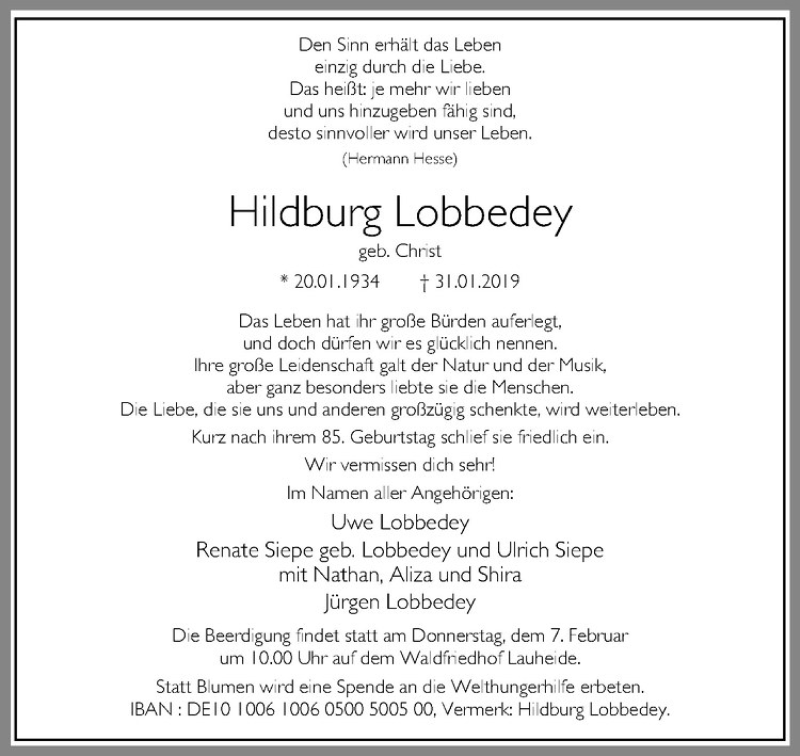 Hier finden Sie alle Traueranzeigen aus der Zeitung, die bisher für Hildeburg Lobbedey erschienen sind. Weitere Traueranzeigen, die in der Zeitung erscheinen, werden hier ebenfalls aufgelistet