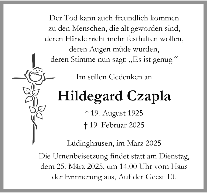 Hier finden Sie alle Traueranzeigen aus der Zeitung, die bisher für Hildegard Czapla erschienen sind. Weitere Traueranzeigen, die in der Zeitung erscheinen, werden hier ebenfalls aufgelistet