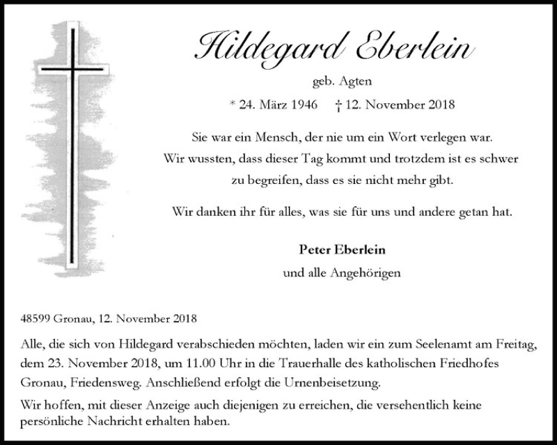 Hier finden Sie alle Traueranzeigen aus der Zeitung, die bisher für Hildegard Eberlein erschienen sind. Weitere Traueranzeigen, die in der Zeitung erscheinen, werden hier ebenfalls aufgelistet