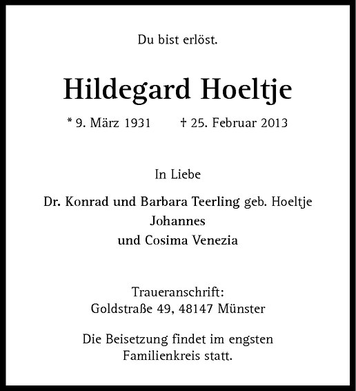 Hier finden Sie alle Traueranzeigen aus der Zeitung, die bisher für Hildegard Hoeltje erschienen sind. Weitere Traueranzeigen, die in der Zeitung erscheinen, werden hier ebenfalls aufgelistet