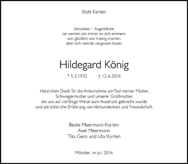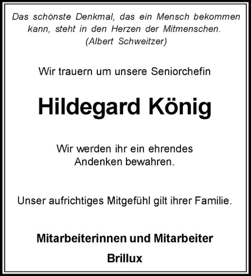 Hier finden Sie alle Traueranzeigen aus der Zeitung, die bisher für Hildegard König erschienen sind. Weitere Traueranzeigen, die in der Zeitung erscheinen, werden hier ebenfalls aufgelistet